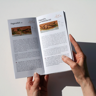 In designing the book, inspiration was drawn from local stone. The colors reflect the surrounding nature: the grey-blue and earthy tones of the rock meet the vibrant orange of the lichens. The cover is cloth-bound, giving it a rough texture that ties it closely to the subject matter. The hiking routes are embossed into the cloth, creating a visual link to the book’s content.